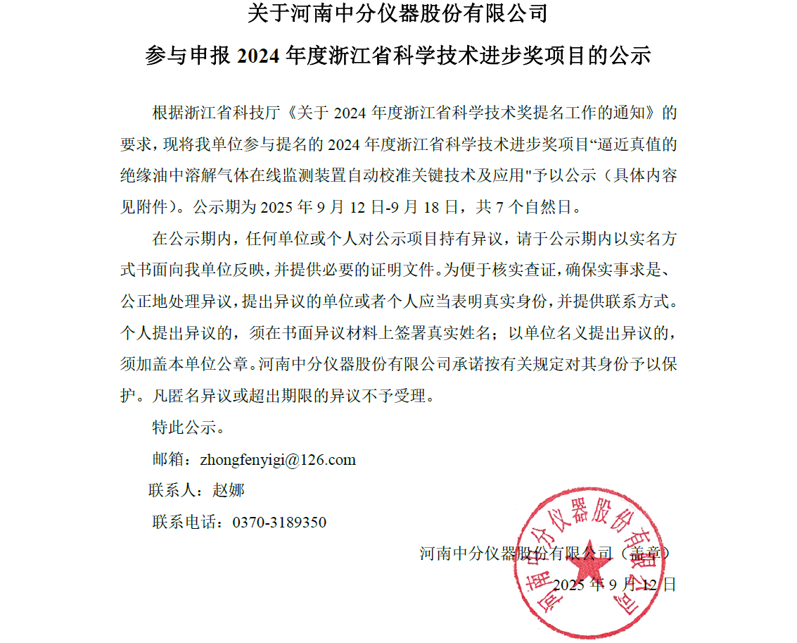 關(guān)于河南中分儀器股份有限公司參與申報(bào)2024年度浙江省科學(xué)技術(shù)進(jìn)步獎(jiǎng)項(xiàng)目的公示